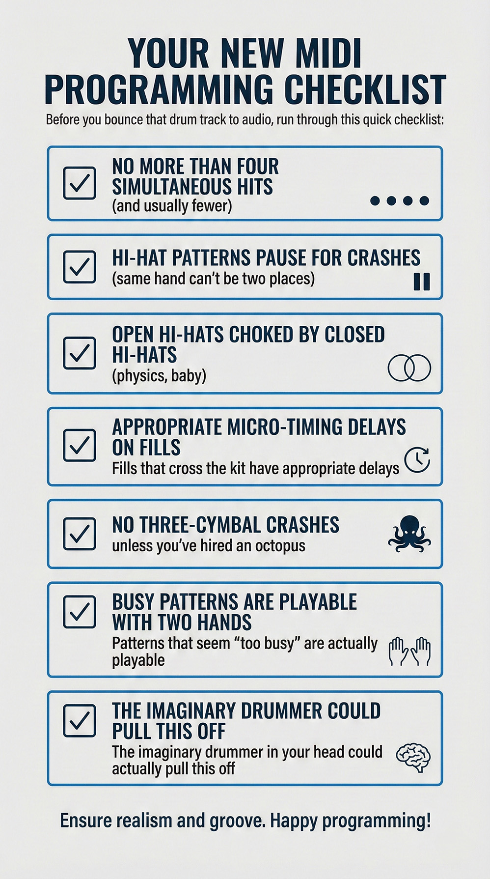 - [ ] No three-cymbal crashes unless you’ve hired an octopus