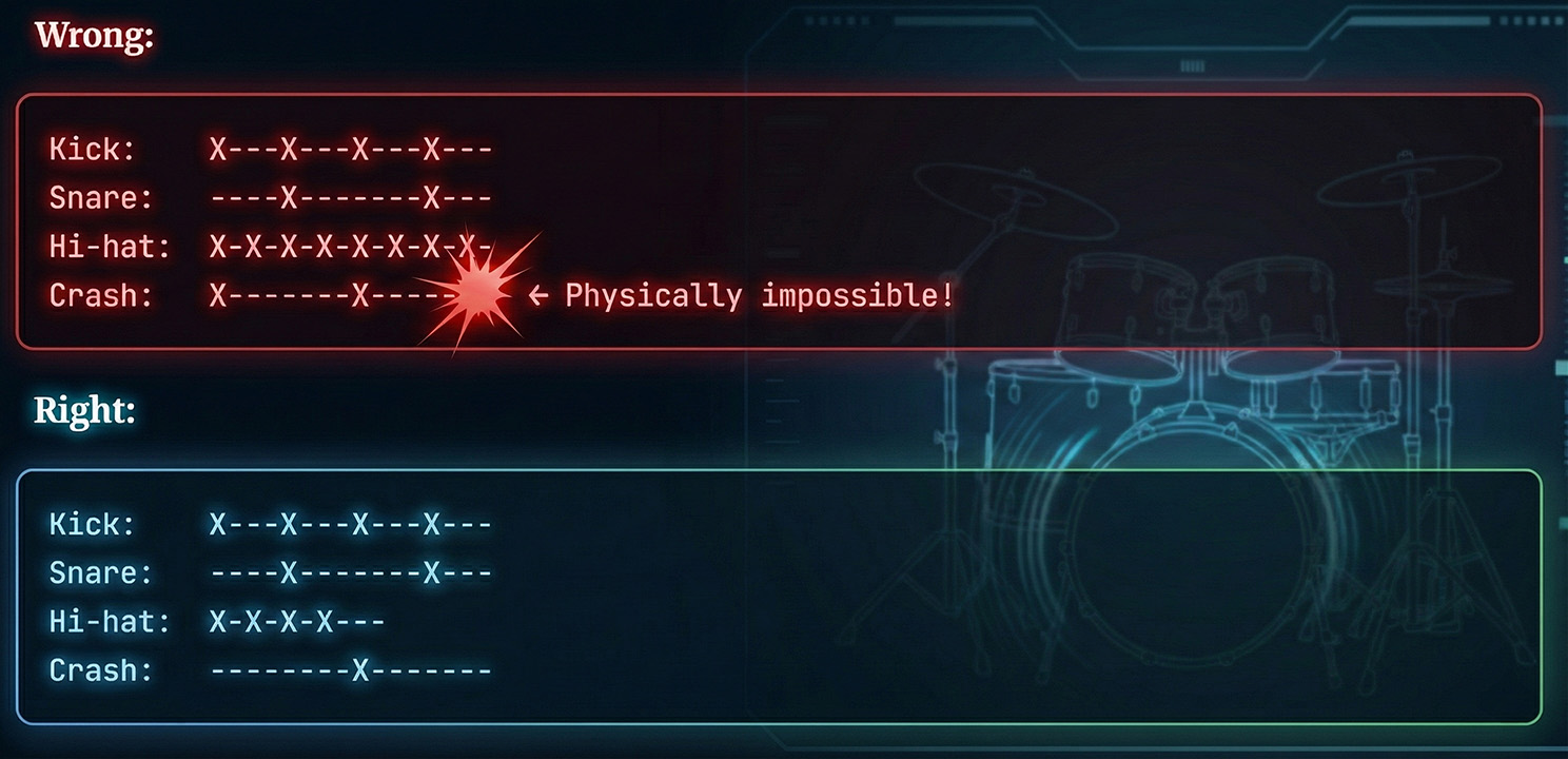 I listened back. He was right. At the 2:15 mark, I had programmed simultaneous hits on the ride cymbal, crash cymbal, floor tom, and hi-hat—all while the kick and snare were going. Unless my imaginary drummer was an octopus, this pattern was physically impossible.